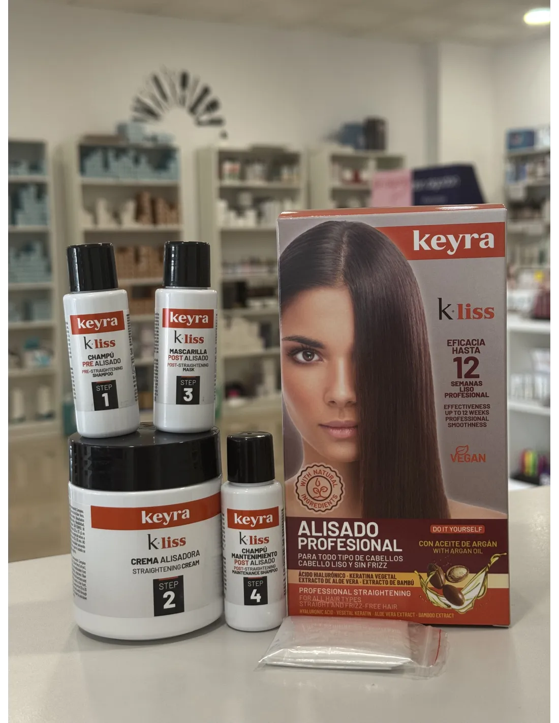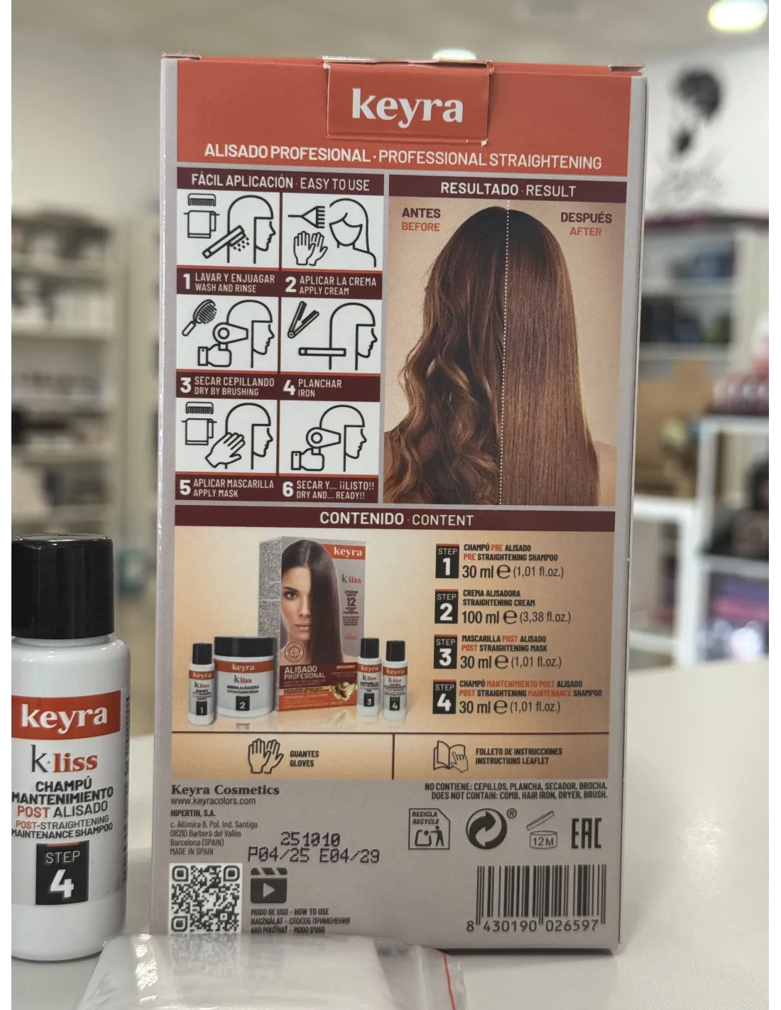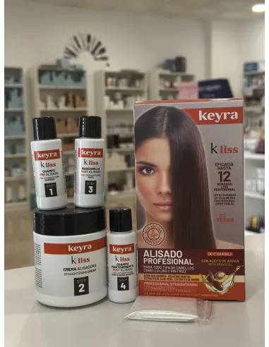 Contiene: Champú pre alisado 30ml, Crema alisadora 100ml, Mascarilla post alisado 30ml y champú mantenimiento post alisado 30ml.