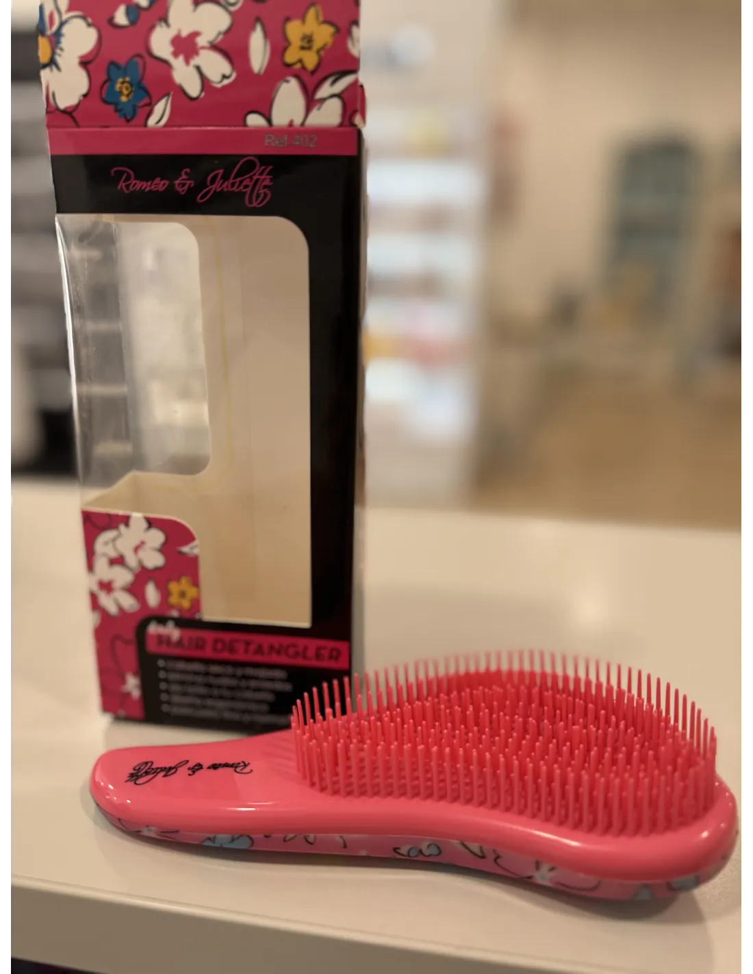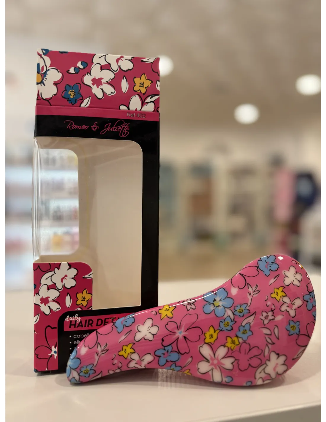 Cepillo ergonómico antitirones decorado con margaritas y disponible en dos colores, rosa y verde agua