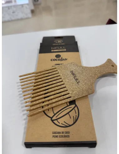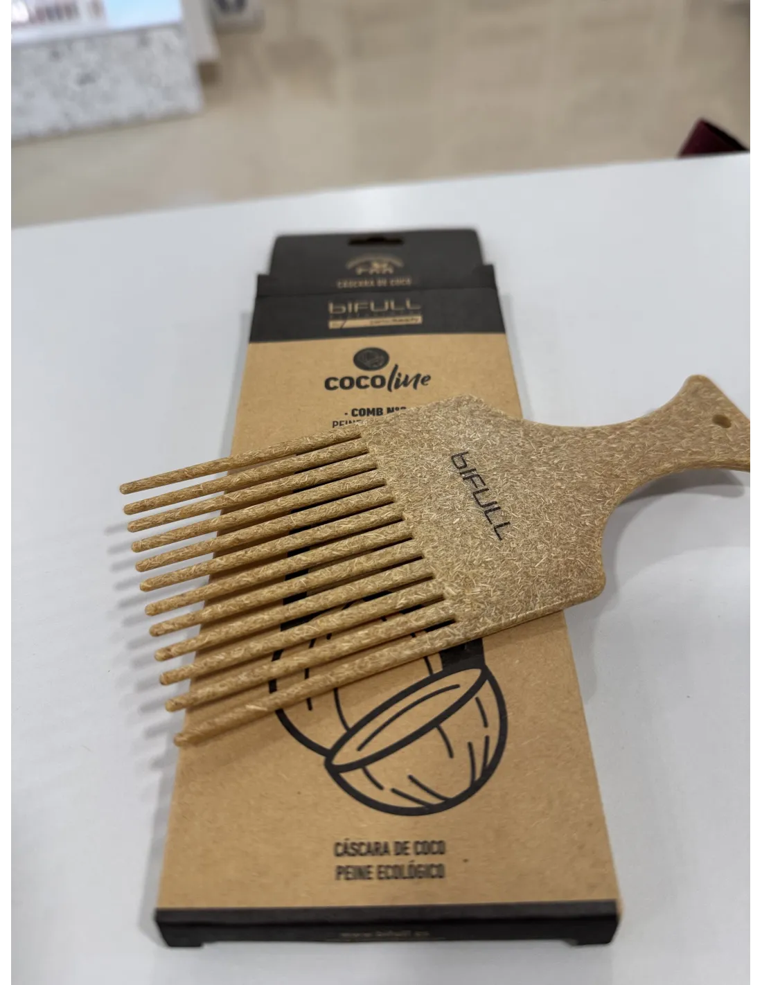 Peine ahuecador fabricado con cáscara de coco, ideal para moldear cabellos rizados sin enredos ni roturas.
